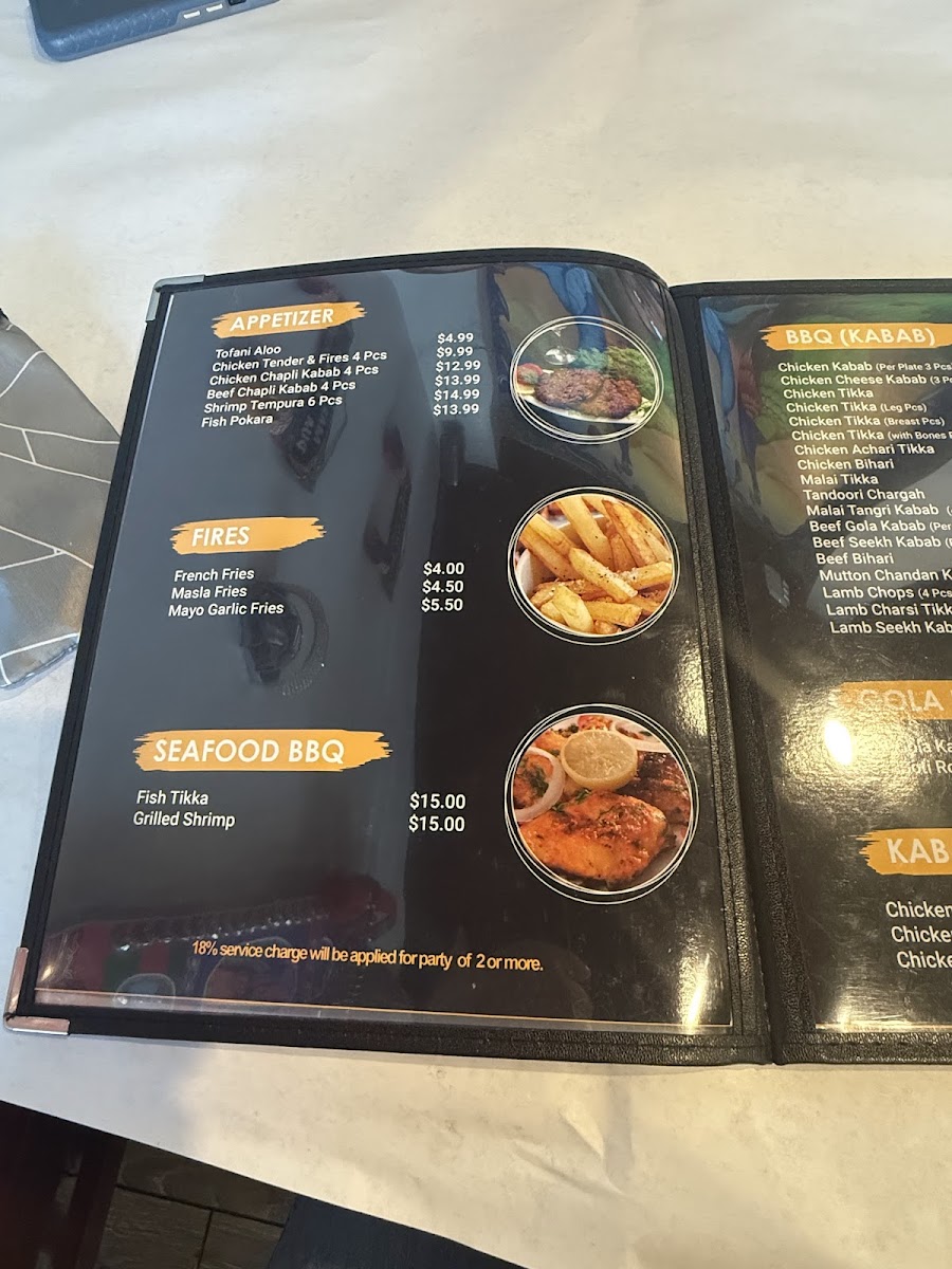 For light bites and appetizers, the menu features items like French Fries, Masala Fries, Mayo Garlic Fries, Toofani Aloo, and Chicken Tenders. The main entrees consist of a range of meat dishes including Goat Karahi (available by the pound), Beef Nihari Bong, Beef Boti Kabab, Seekh Kabab, Bihari Kabab, Tandoori Chicken, and Chicken Biriyani, offering options suitable for both casual meals and more substantial dining occasions.